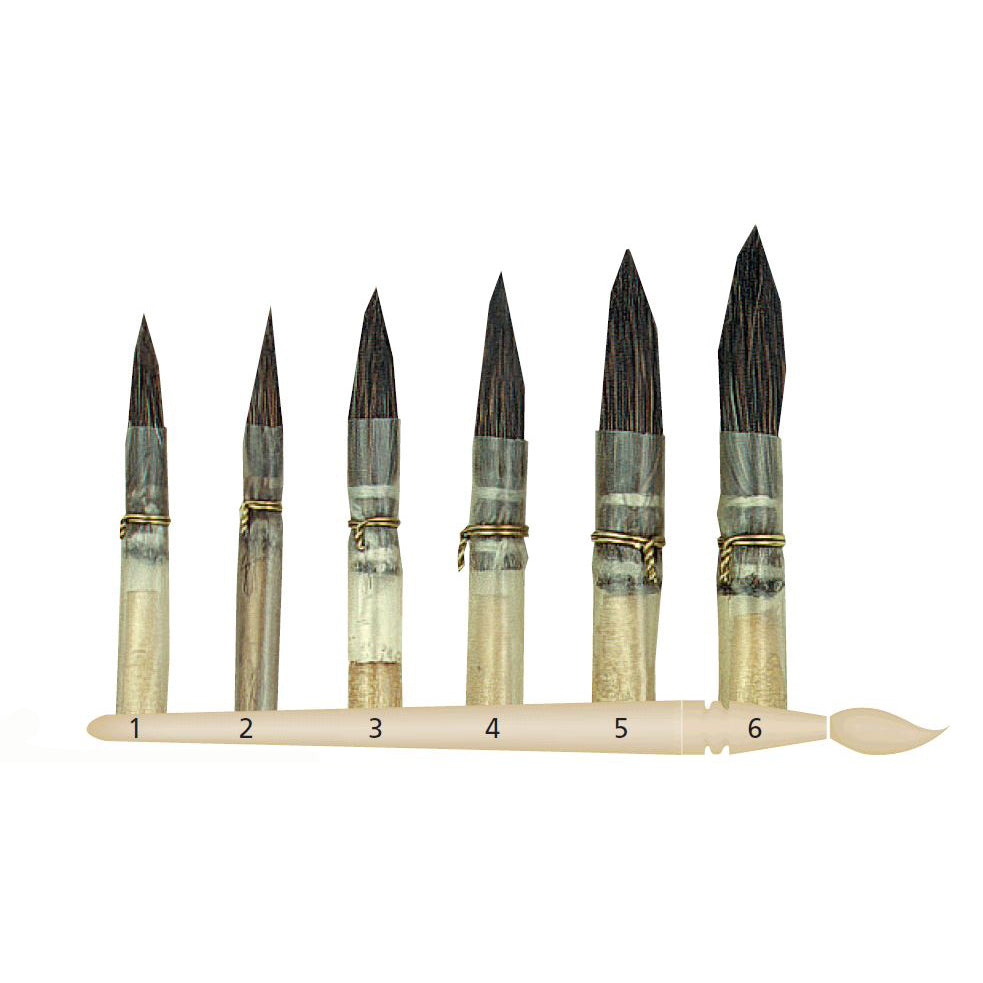 Grain de blé, court Pinceau en petit gris pur, plume collée sur hampe en bois verni.