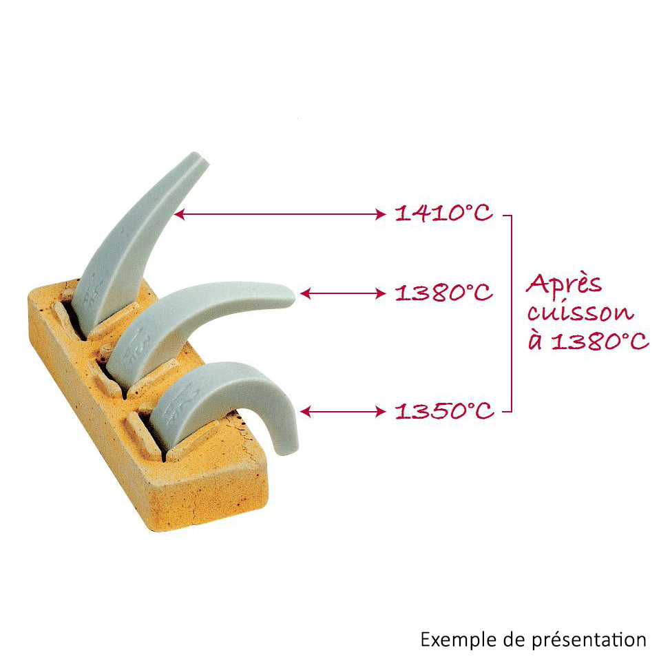 Très important : Les cônes indiquent un état de cuisson, ils ne sont pas faits pour exprimer les températures en degrés. La manière de cuire, oxydant ou réducteur, ou le cycle de cuisson peuvent modifier la température d'effondrement des montres. Les températures données ci-contre sont obtenues avec une vitesse de montée de 150°C.