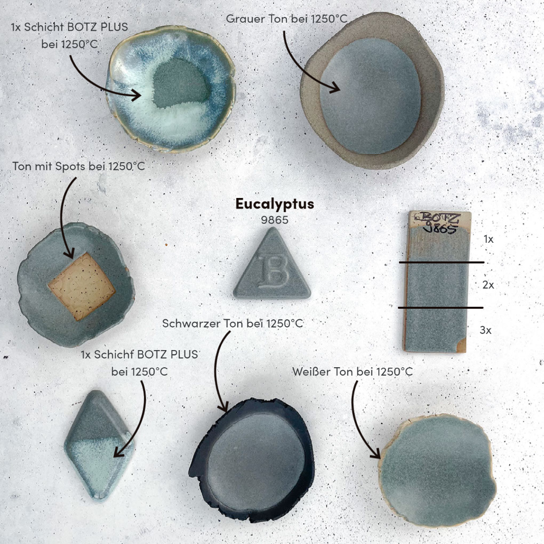 1250 °C : teinte moyenne vert-bleu, granit mat, joli jeu d’effets.