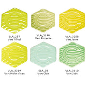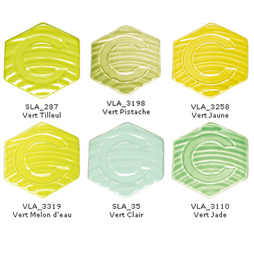 PALETTE DECOUVERTE SANS PLOMB : Les Emaux "VERT CLAIR" Afin de vous permettre de découvrir les nuances des émaux CERADEL, le produit "PALETTE DECOUVERTE" est constitué d'un ensemble de 6 pots de 200 g de poudre des 6 références CERADEL qui, habituellement sont vendues en conditionnements 0,5 ; 1 ou 5 kg. Cliquer sur la vignette pour aller sur la fiche article de l'émail vendu séparément, en conditionnement 0,5 ; 1 ou 5 kg ou pour découvrir le détail de sa fiche produit. SLA_287 Vert Tilleul VLA_3198 Vert Pistache VLA_3258 Vert Jaune VLA_3319 Vert Melon d'eau SLA_35 Vert Clair VLA_3110 Vert Jade